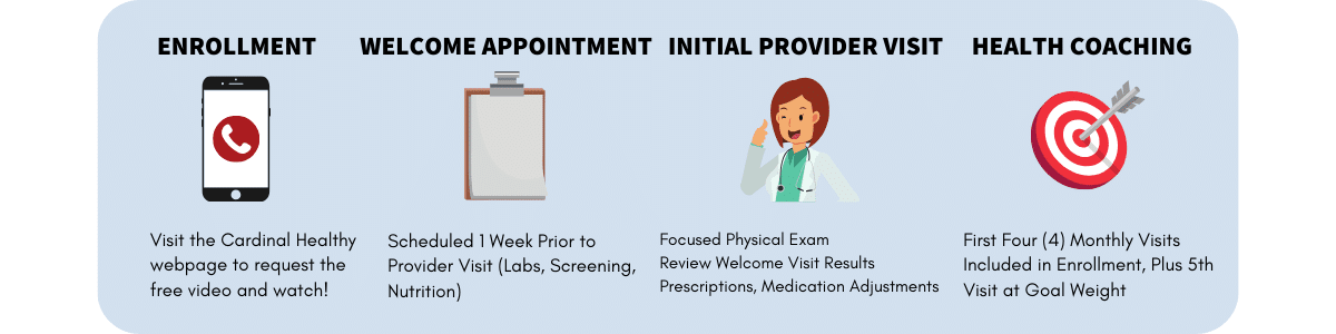 The Medical Weight Loss Program offers bundled pricing. The enrollment fee includes three lab draws, the welcome appointment with a Medical Assistant, EKG, Body Composition Analysis, a Medical Weight Loss Provider Appointment, and at least two Health Coach Appointments. In addition to the start-up labs, the enrollment fee also includes the labs that will be drawn at 10% weight loss and at the best achieved weight. The enrollment fee bundle cost is $200 and will be due in full at the time you register for the program. After the enrollment period is through, the monthly cost for Medical Weight Loss Provider visits is $25 per appointment, and Health Coach appointments are no charge as long as you are in the active weight loss phase of the program. If you choose to utilize prescriptions medicine for weight loss, the cost is additional and starts at $15 per month.  There are no required products to buy, contracts, or hidden costs to the ReforMedicine Medical Weight Loss Program at Cardinal Healthy. You pay as you go for the appointments as they take place after the enrollment fee.